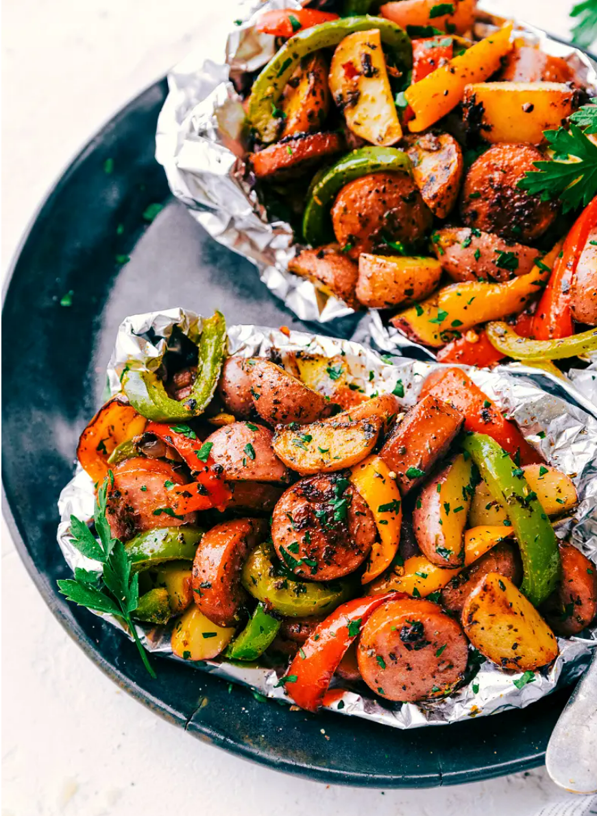 Before adding the sausage and veggies, generously spray the foil to keep the veggies from sticking and burning on the bottom.